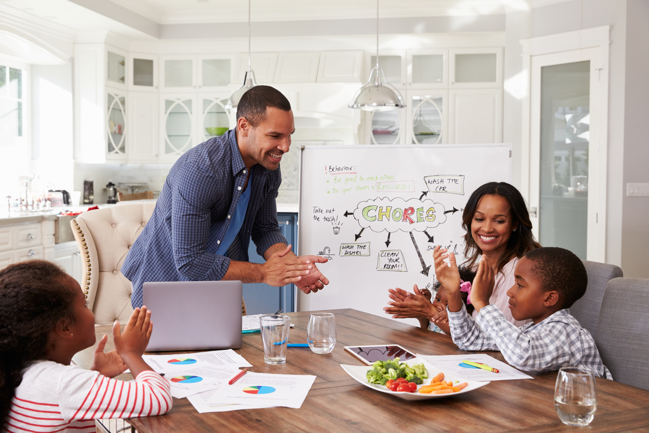 Family clapping at a domestic meeting in their kitchen - Crossroads ...